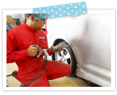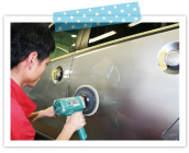 へこんでしまった箇所の塗装を削って剥がし、スタッドという溶着引張機などを使って表面を出来るだけ元の状態に近く修復し、その後鉄板のわずかな凸凹を補正する為にパテを使い表面を仕上げます。鈑金作業の中では仕上がりを左右する重要な作業です。